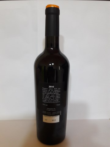 Primitivo del Salento IGP, vino prodotto da uve primitivo coltivate in agro di Manduria a pochi chilometri dal mare. Dal colore rosso intenso con riflessi violacei, corposo ed equilibrato, ha profumi di frutta di bosco, cacao e vaniglia. Speziato nel finale. Temperatura di servizio 16-18° C. - 15% vol. - 750ml